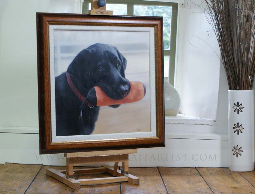 Steve Foutty from the USA contacted us in early 2013 about commissioning a portrait of his much-loved black Labrador, Sammy. He enclosed a couple of photos that he thought would work well for an oil painting and told us all about Sammy’s favourite things—especially spending time near the boat with his favourite retrieve toy.