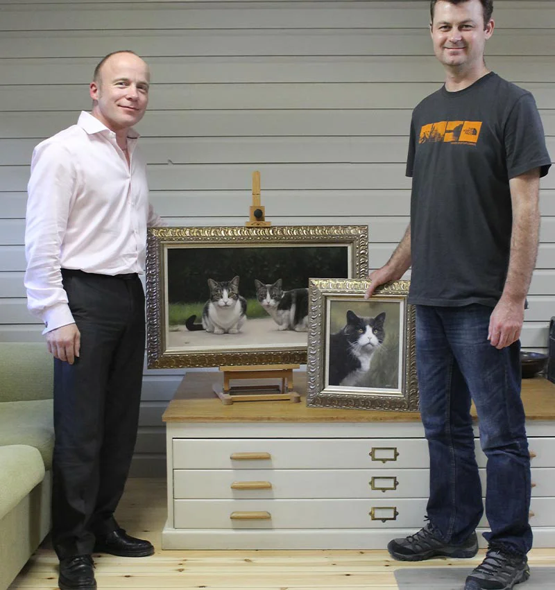 Alan later visited our studio in person to collect both this portrait of Purdy and another painting he commissioned of their two other cats, Milly and Molly. Scroll down to see the framed artwork and lovely photos of Alan, Amanda, and Nicholas with the finished paintings.