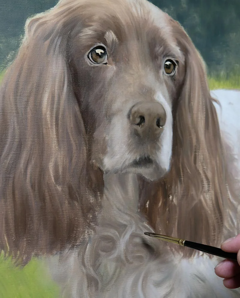 If you’re a Spaniel lover, you’re in good company — they’re one of Nicholas’ favourite breeds to paint. This portrait of **KitKat**, commissioned as a surprise birthday gift, was traditionally hand painted in oils on Italian linen canvas. Scroll down to read more about the commission and view photos of the framed painting, reference image, and a lovely testimonial from the client.